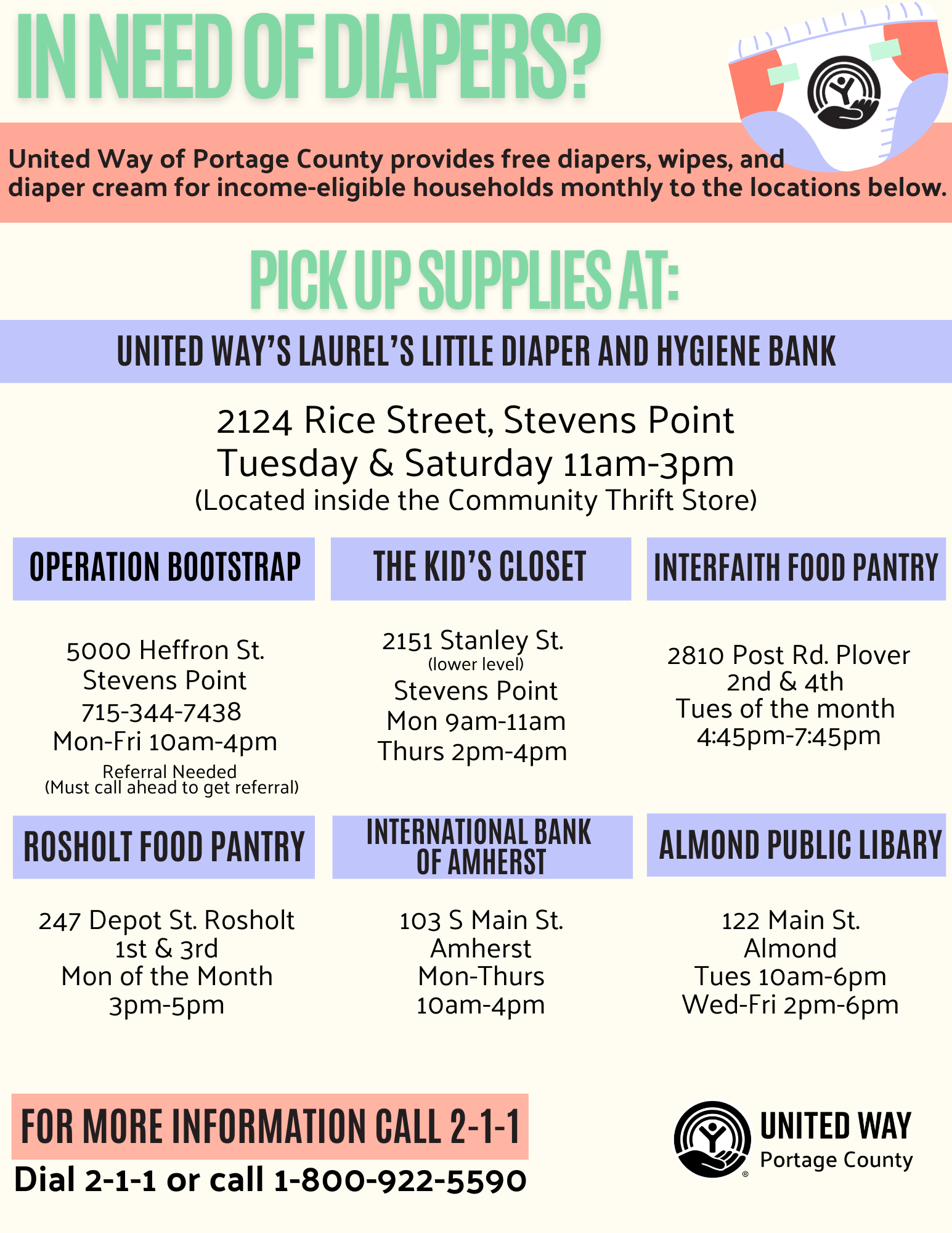 Monetary Donations: Drop off or mail cash or checks to United Way of Portage County at 2801 Hoover Rd. Unit 2, Stevens Point, WI 54481. Make out checks to United Way of Portage County and add “Diaper Drive” to the memo section. Donate online and add “Diaper Drive” in the comments section.